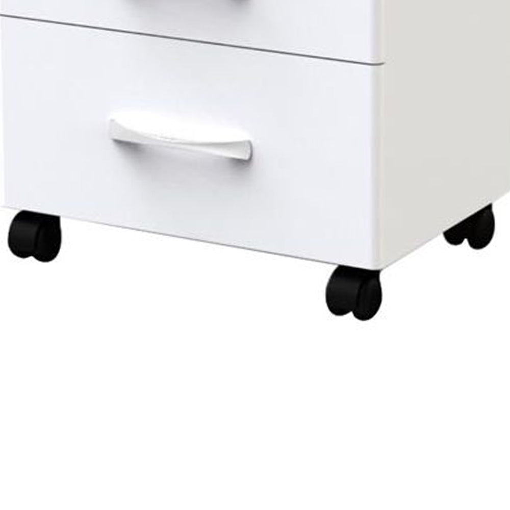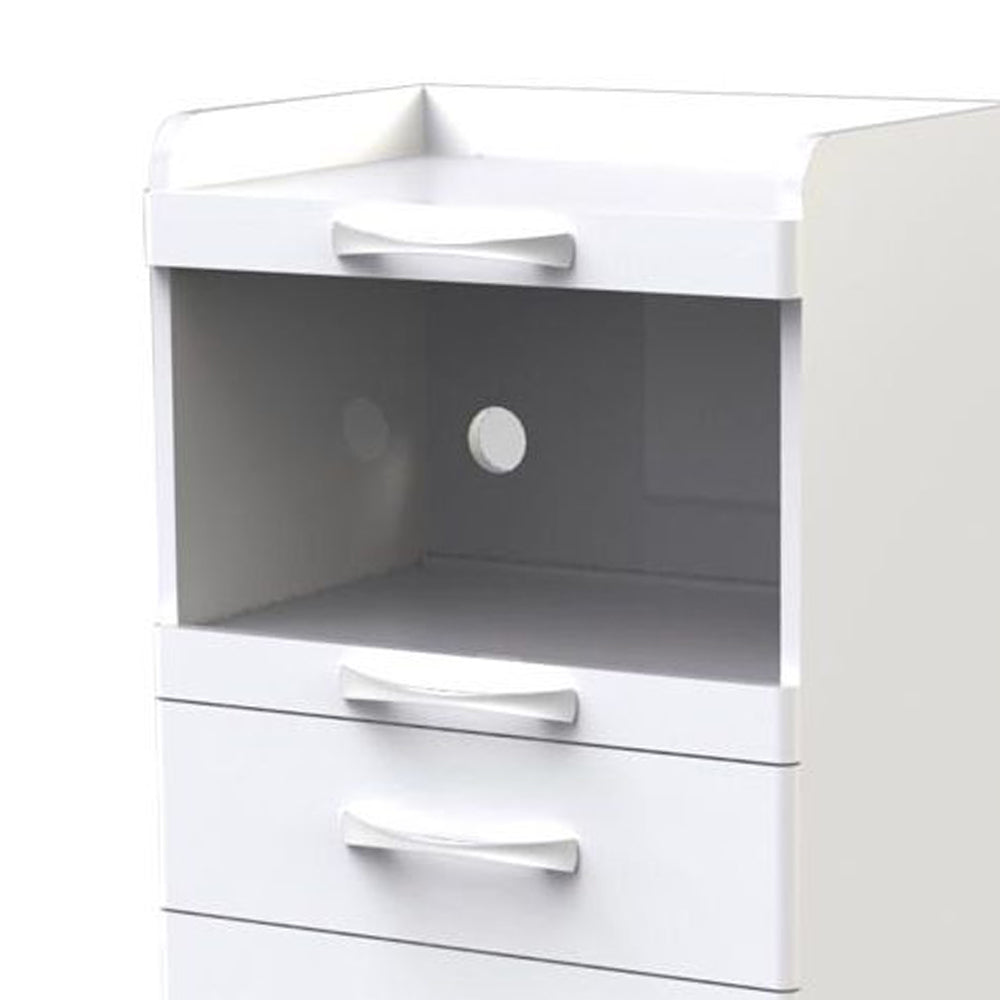 Elegante carrello dalla struttura in legno laccato bianco. Dotato di 2 cassetti, uno spazio centrale per le apparecchiature con ripiano scorrevole e 4 ruote piroettanti.