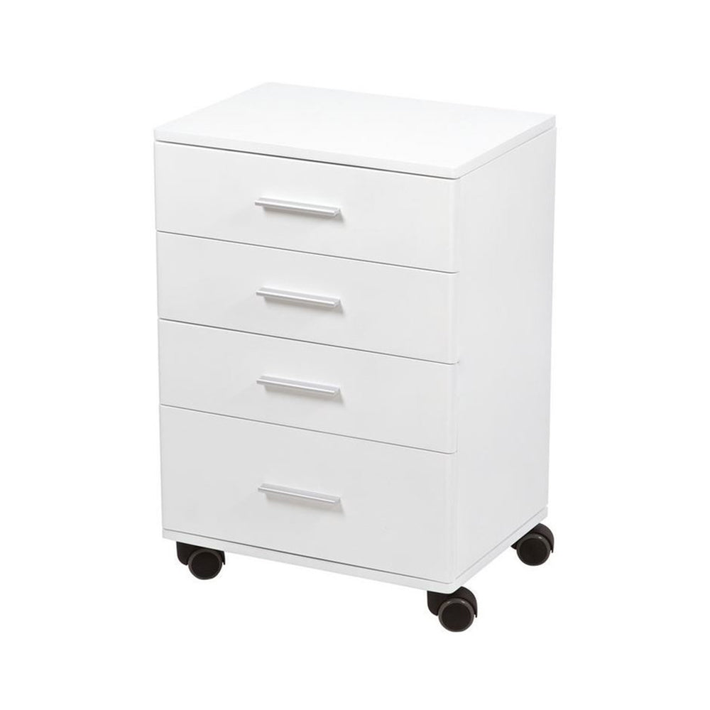 Elegante e moderno carrello realizzato in legno verniciato bianco. Dotato di 4 cassetti per conservare gli accessori nei centri di bellezza. Totale mobilità grazie alle 4 ruote piroettanti.