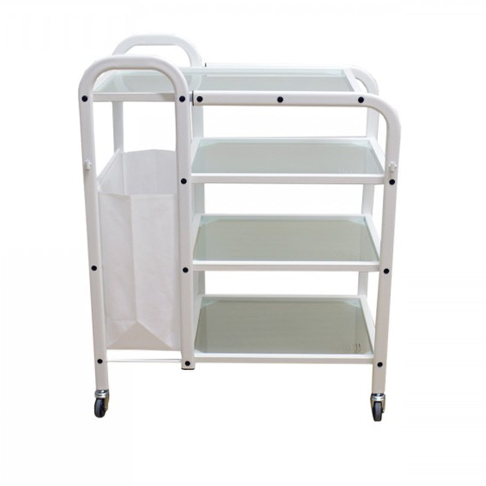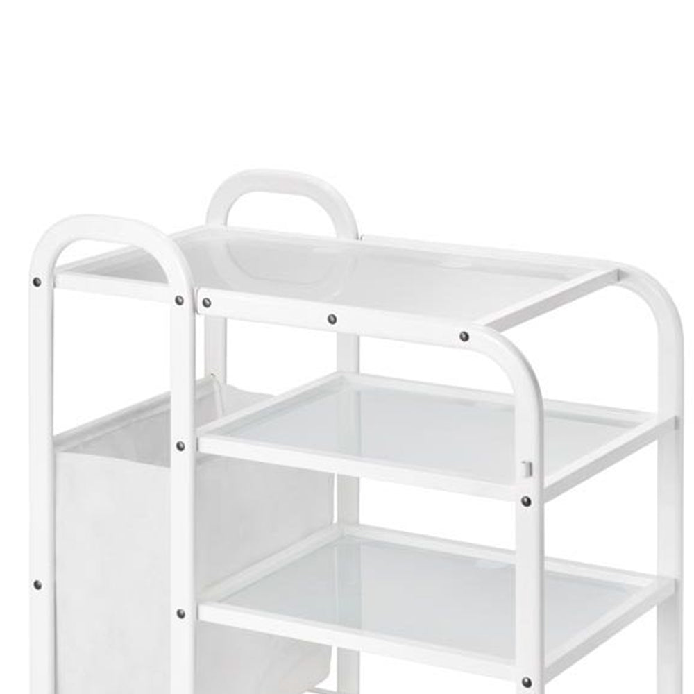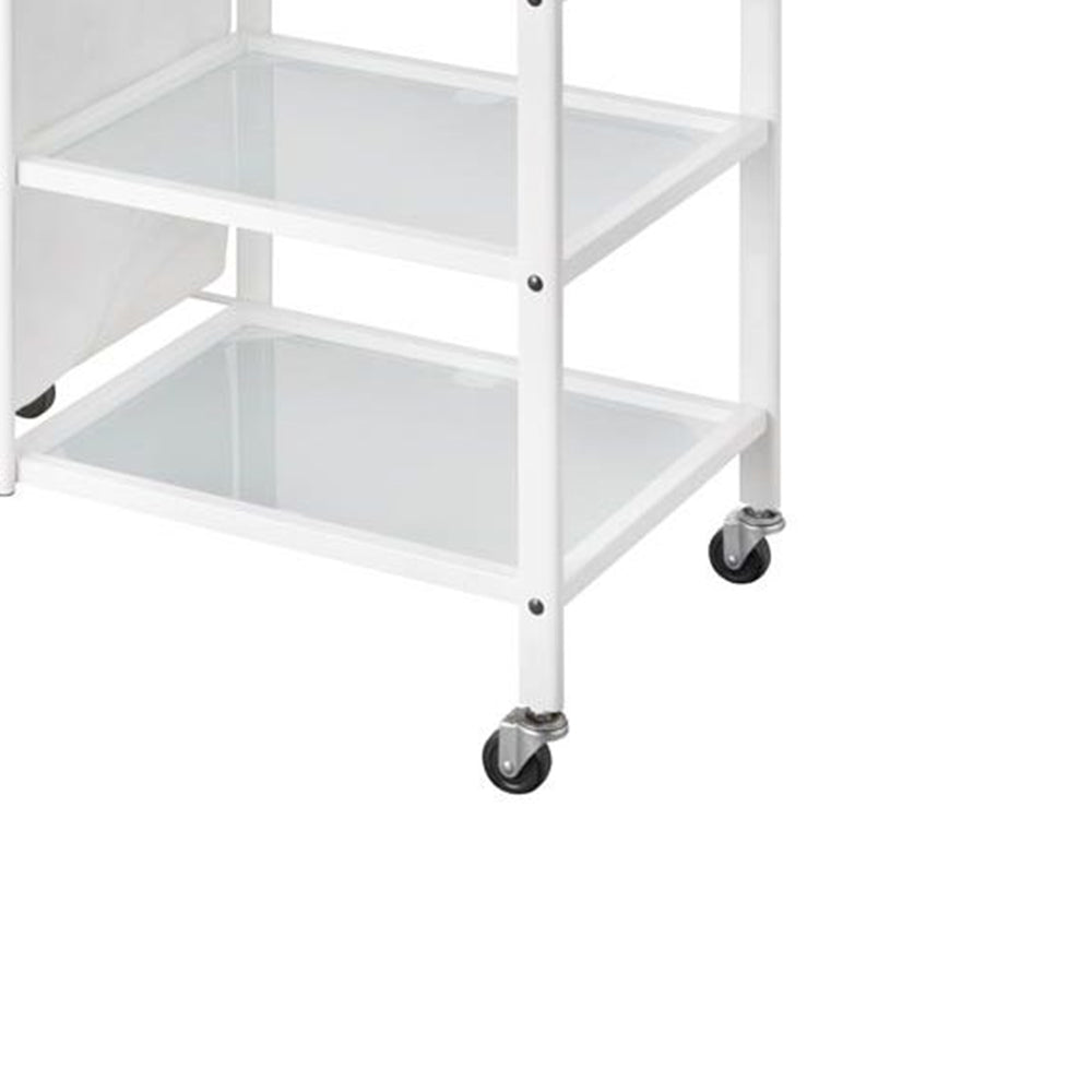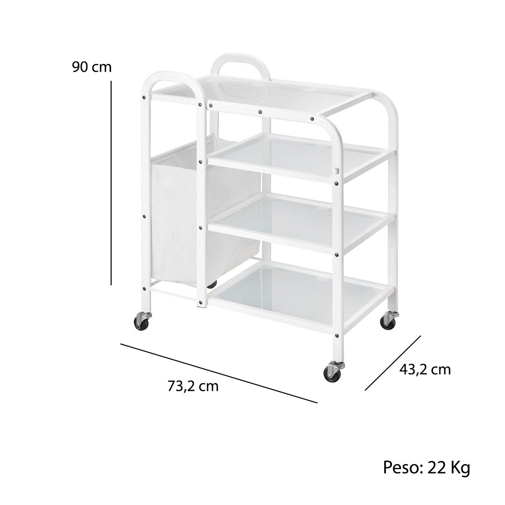 Carrello dalla struttura metallica bianca dal design moderno e pratico. Dotato di 4 ripiani di vetro traslucido e borsa laterale in fibra di cotone. Totale mobilità grazie alle sue 4 ruote.