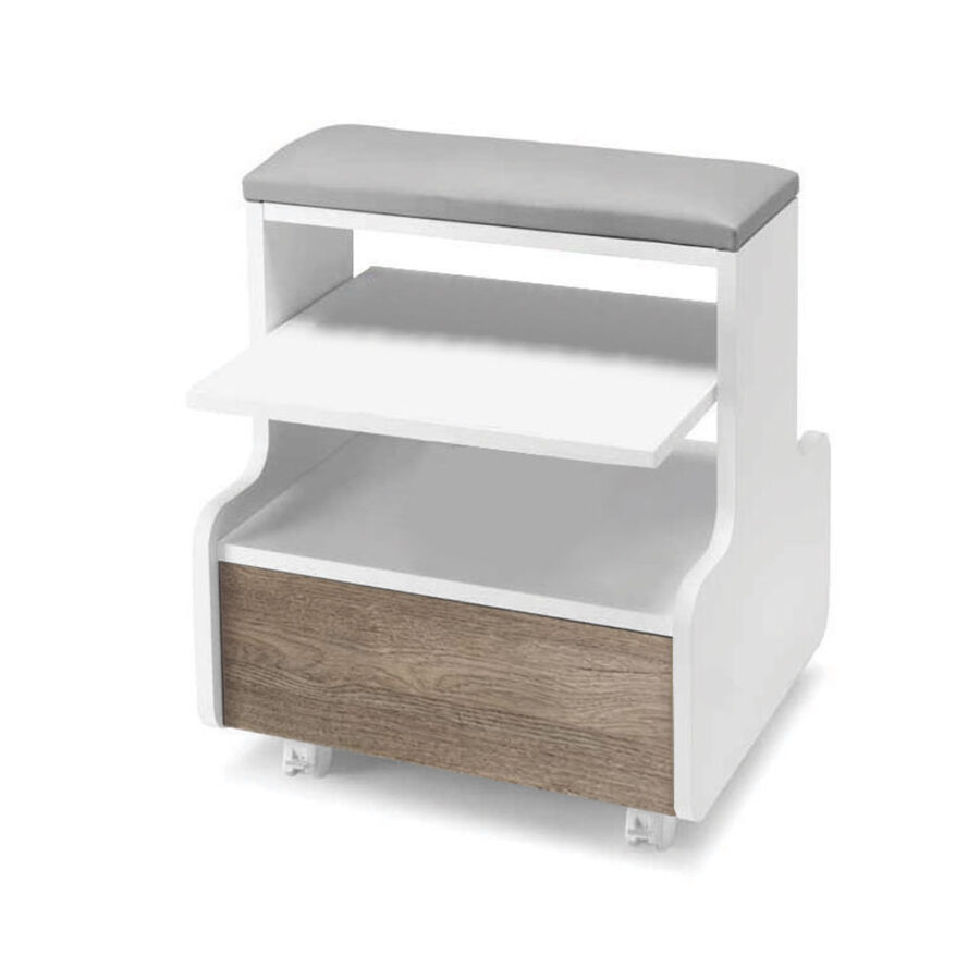 Sgabello per pedicure in nobilitato bianco. Cuscino superiore 50 x 20 cm ripiano scorrevole ed amovibile. Cassetto push and pull con frontale disponibile in 3 diverse finiture. Ruote piroettanti con freni.