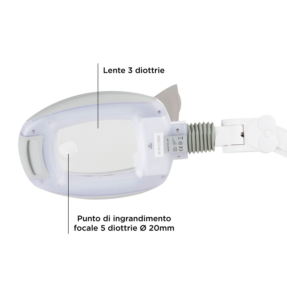 • lente di ingrandimento a 3 diottrie con punto d’ingrandimento 5 diottrie per una vista dettagliata dell’area di lavoro;
