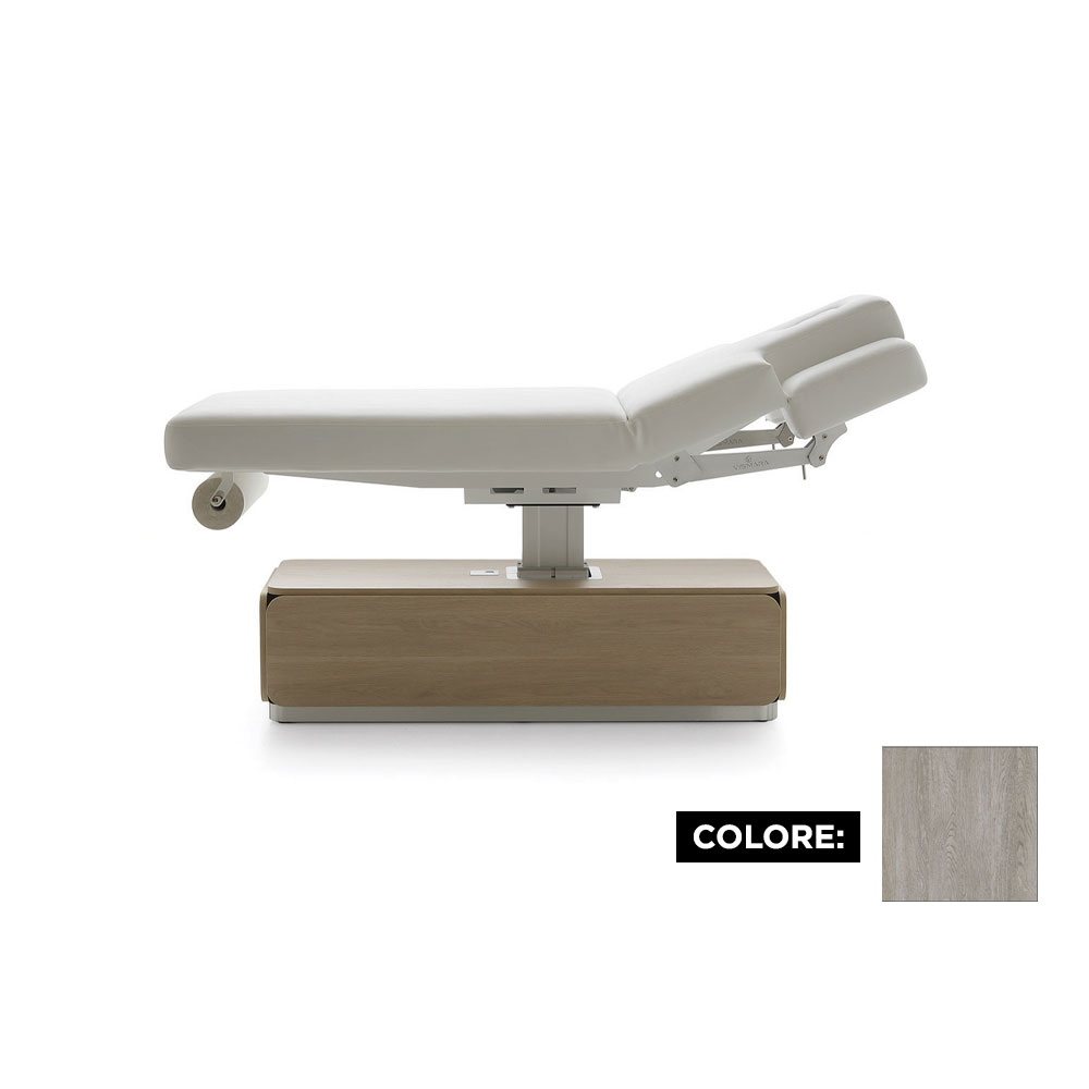 Lettino per massaggi elettrico con mono colonna. Il basamento è realizzato in nobilitato disponibile in 10 diverse finiture. Il materasso in skai disponibile in 12 colori (standard bianco-VIS10) è dotato di foro facciale con relativo tappo e portarotolo. L’altezza del lettino e l’inclinazione dello schienale sono regolabili tramite l’utilizzo di un comodo telecomando.Il basamento è dotato di anta a ribalta e può essere utilizzato come mobile per il posizionamento di accessori.