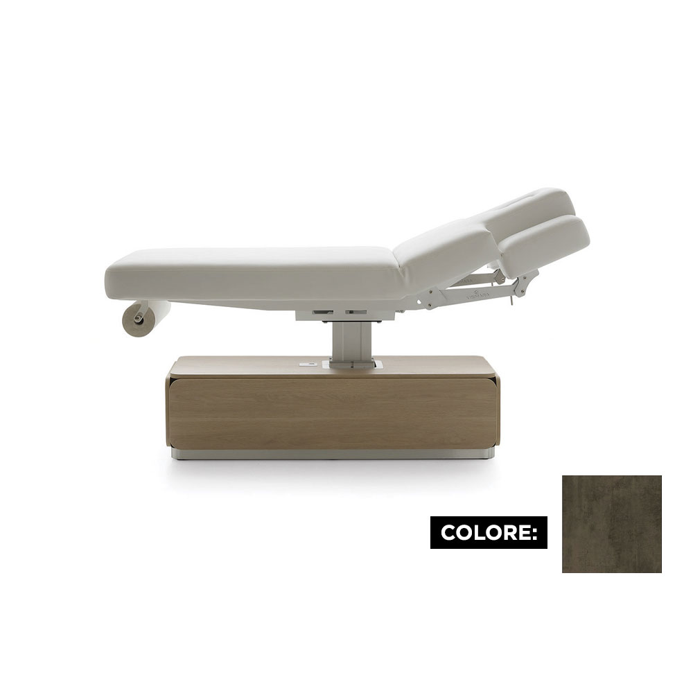 Lettino per massaggi elettrico con mono colonna. Il basamento è realizzato in nobilitato disponibile in 10 diverse finiture. Il materasso in skai disponibile in 12 colori (standard bianco-VIS10) è dotato di foro facciale con relativo tappo e portarotolo. L’altezza del lettino e l’inclinazione dello schienale sono regolabili tramite l’utilizzo di un comodo telecomando.Il basamento è dotato di anta a ribalta e può essere utilizzato come mobile per il posizionamento di accessori.