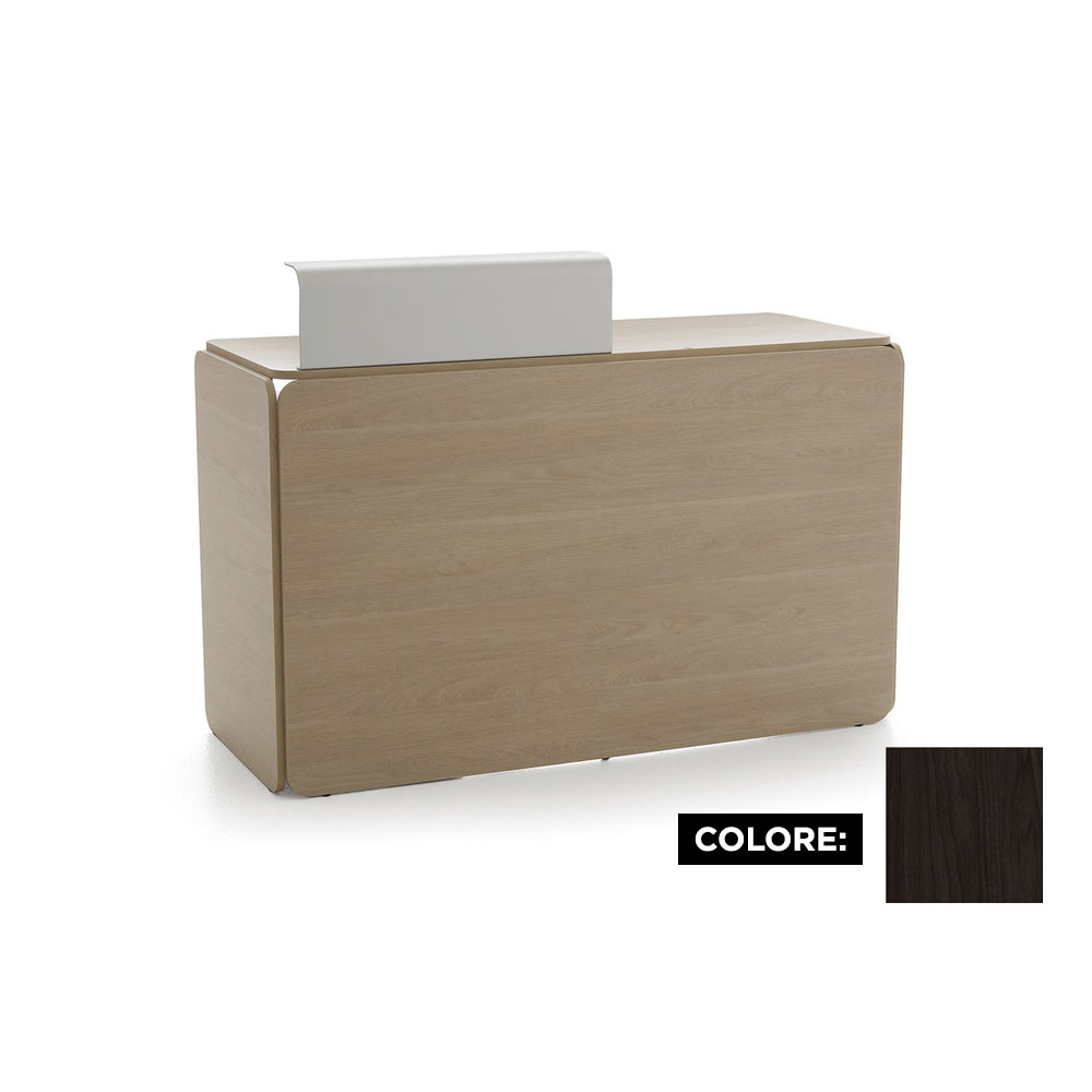 Reception nat 16/9 realizzata in nobilitato disponibile in 10 diverse finiture.Dotata di cassetto con chiave, vani a vista, anta con ripiano internon e divisorio in marrone tiger per area privata, posizionabile a destra o a siistra