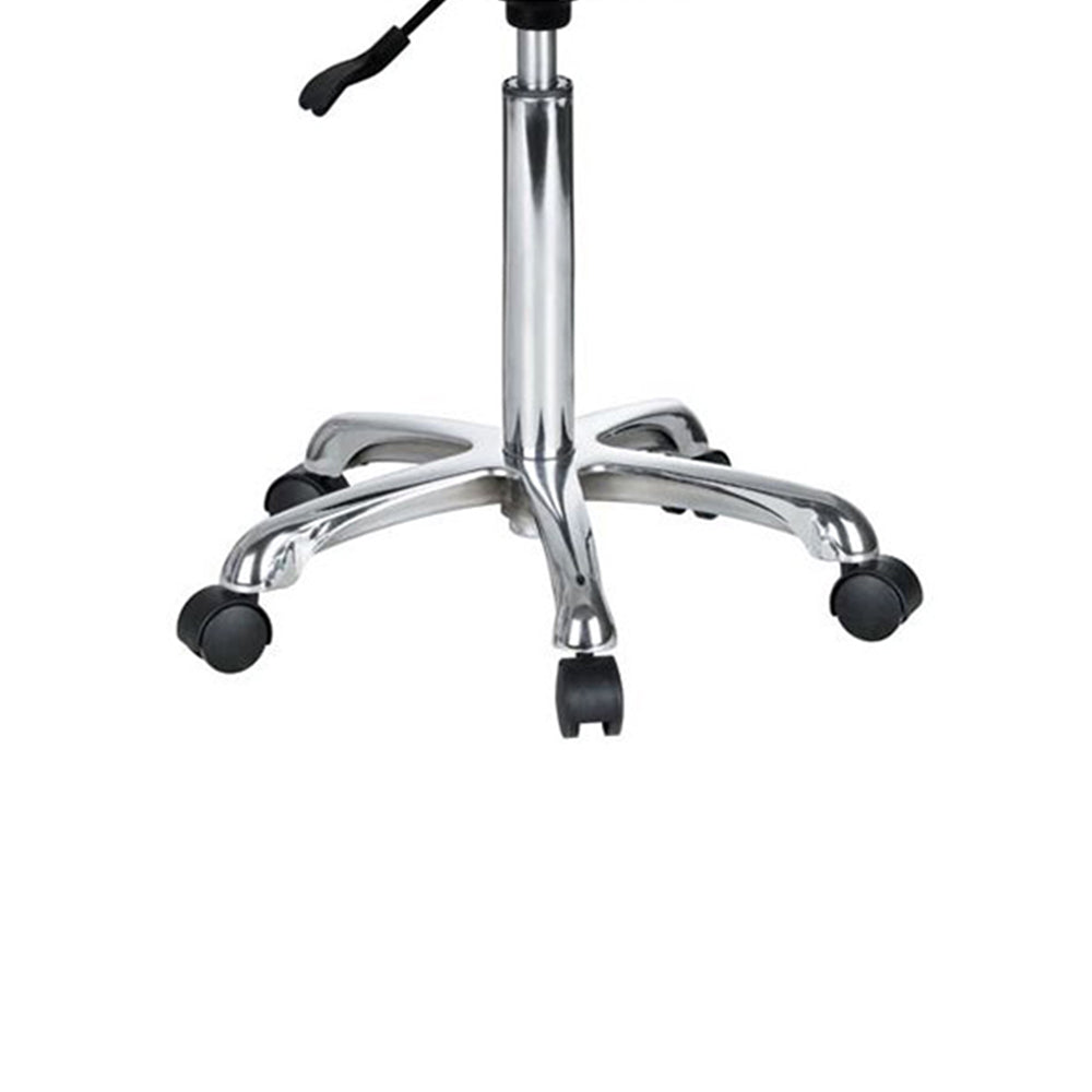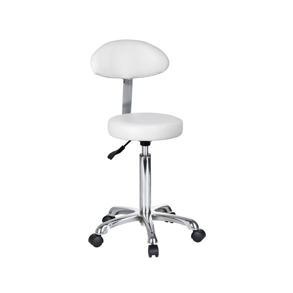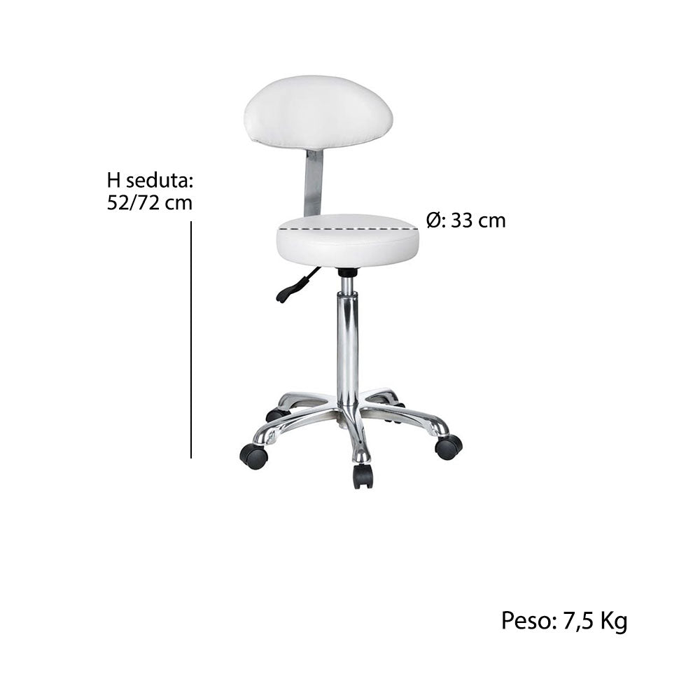 Pratico sgabello dal design ergonomico. Schienale ergonomico, rivestito in PU bianco. Seduta piana e rotonda, rivestita in PU bianco. Altezza regolabile tramite pistone a gas.