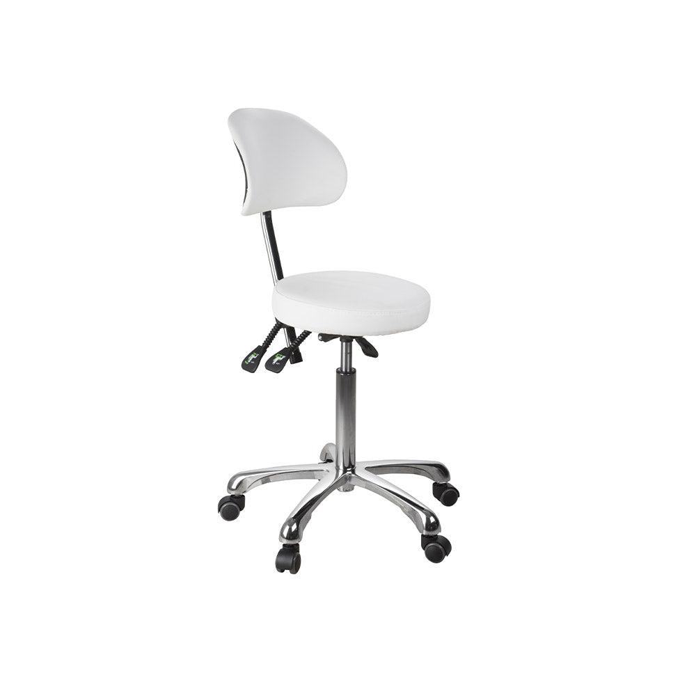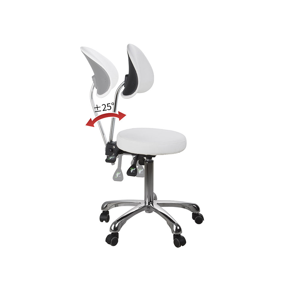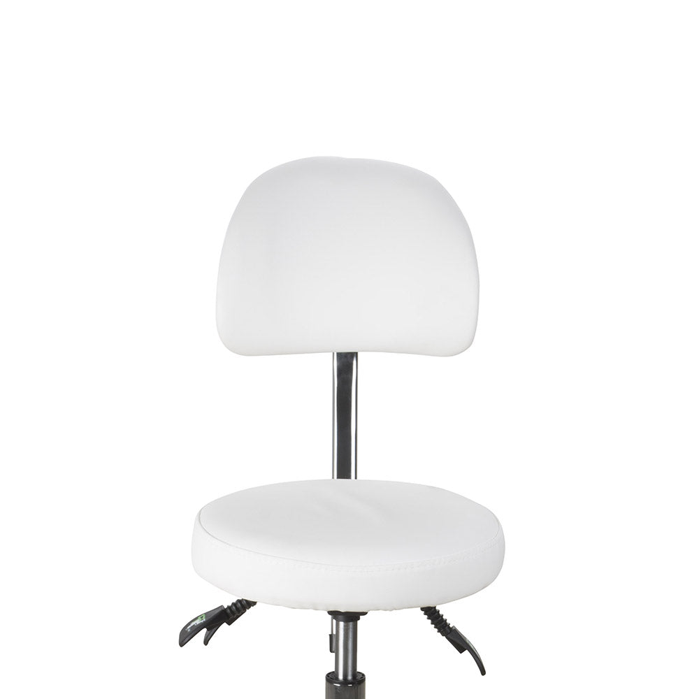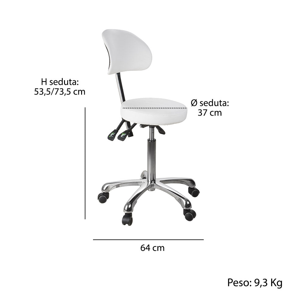 Sgabello versatile, con schienale. Rivestimento in PU bianco. Provvisto di 3 leve che regolano l’inclinazione della seduta e dello schienale e l’altezza. Base dotata di 5 ruote piroettanti