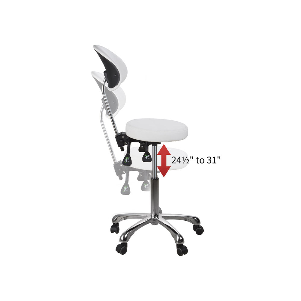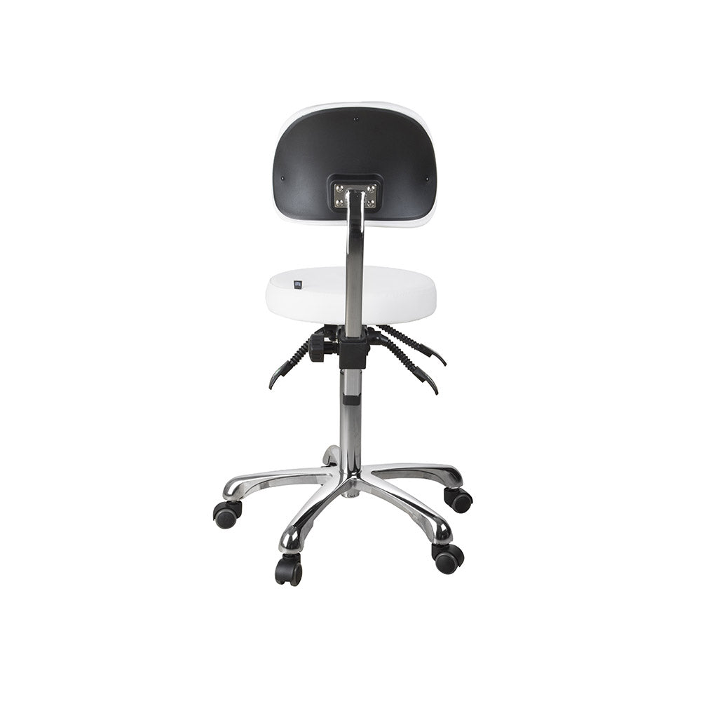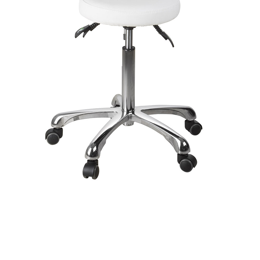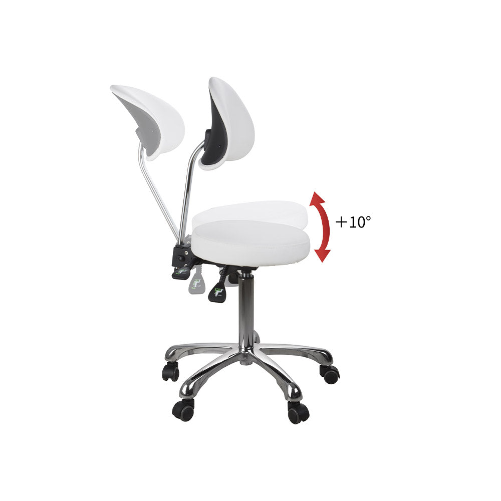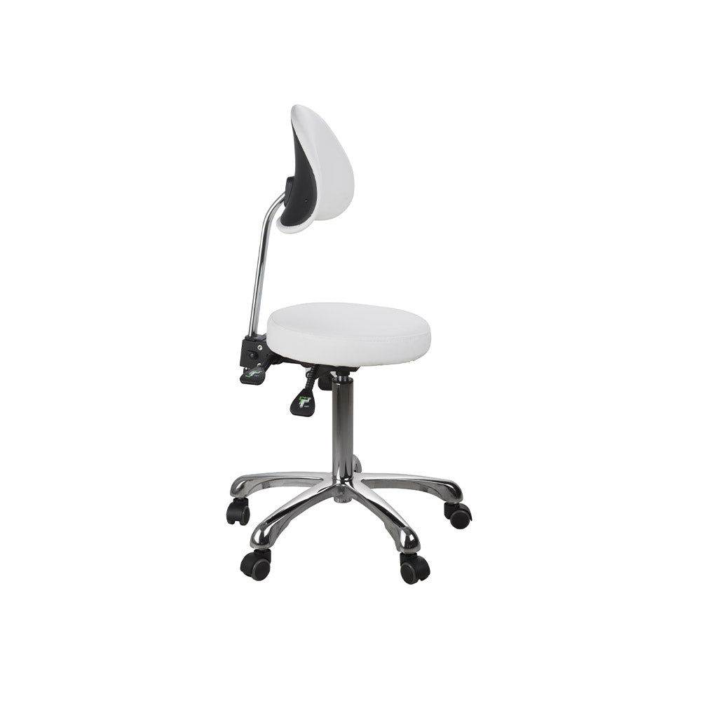 Sgabello versatile, con schienale. Rivestimento in PU bianco. Provvisto di 3 leve che regolano l’inclinazione della seduta e dello schienale e l’altezza. Base dotata di 5 ruote piroettanti