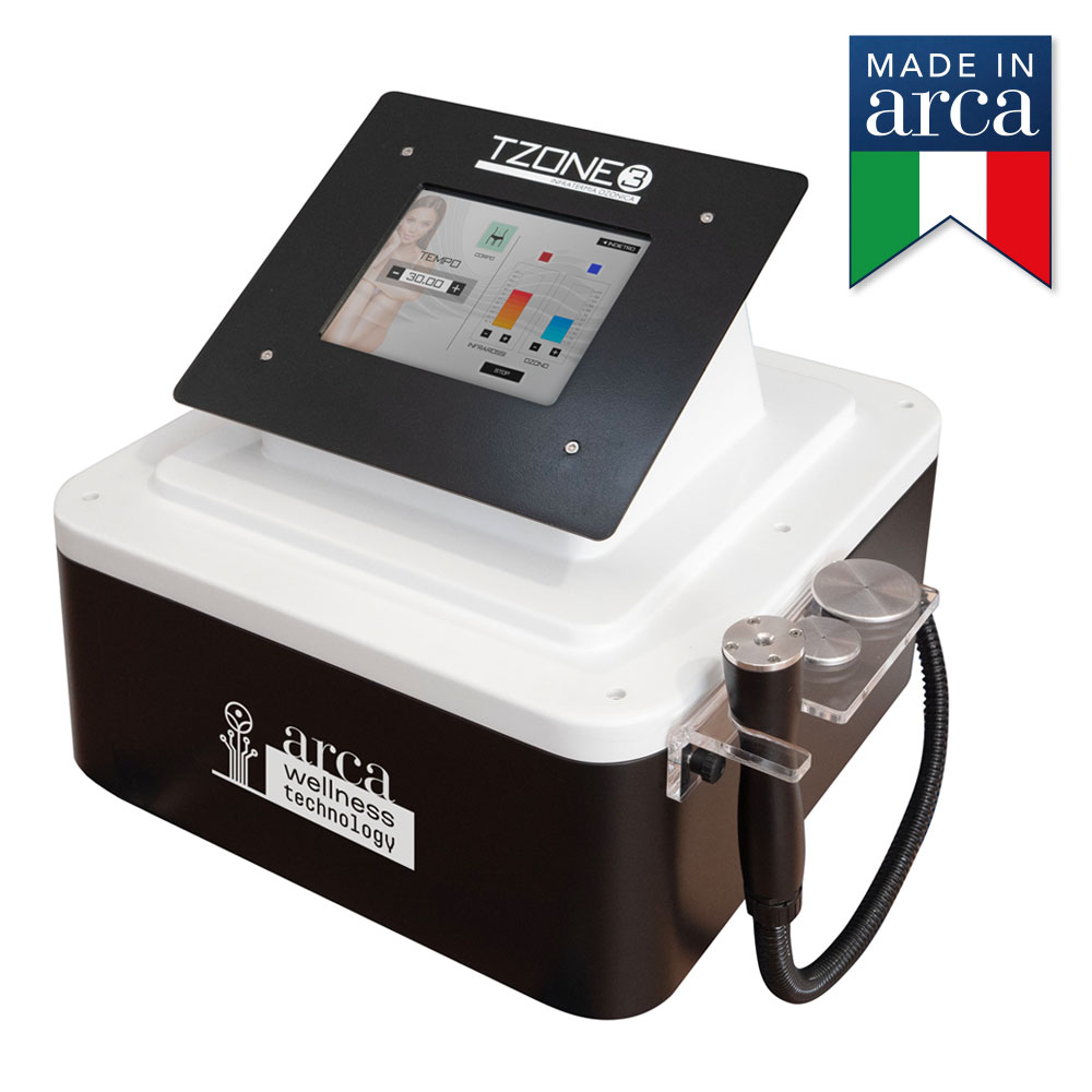 TZONE3 Infratermia a impulsi generati a frequenza elevata (20.000 Hz) agisce sui tessuti superficiali e profondi. Dotato di display touch screen, manipolo con doppia funzione e 2 testine (una per il viso e una per il corpo) e supporto.